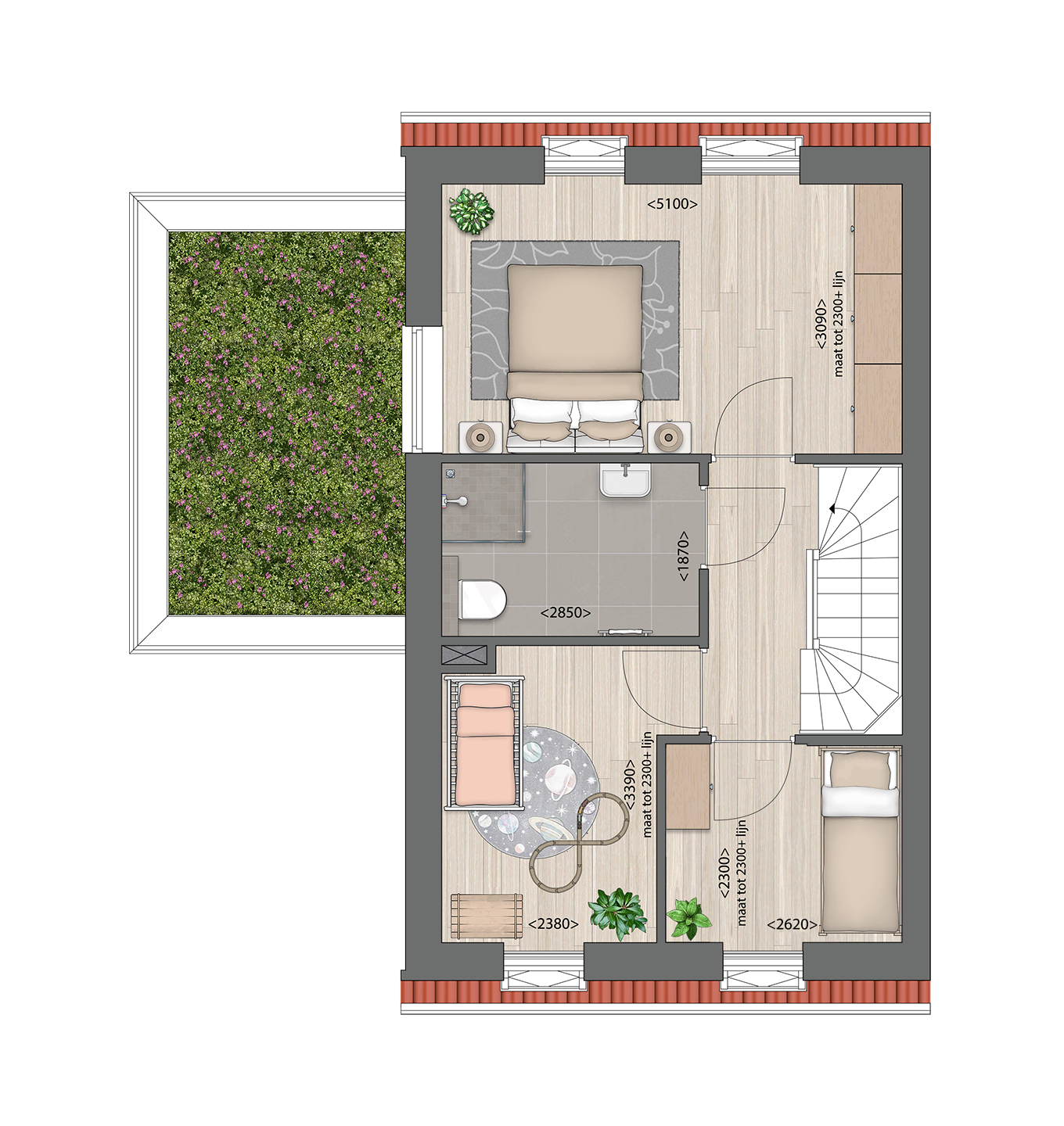 • 3 slaapkamers op de 1e verdieping
